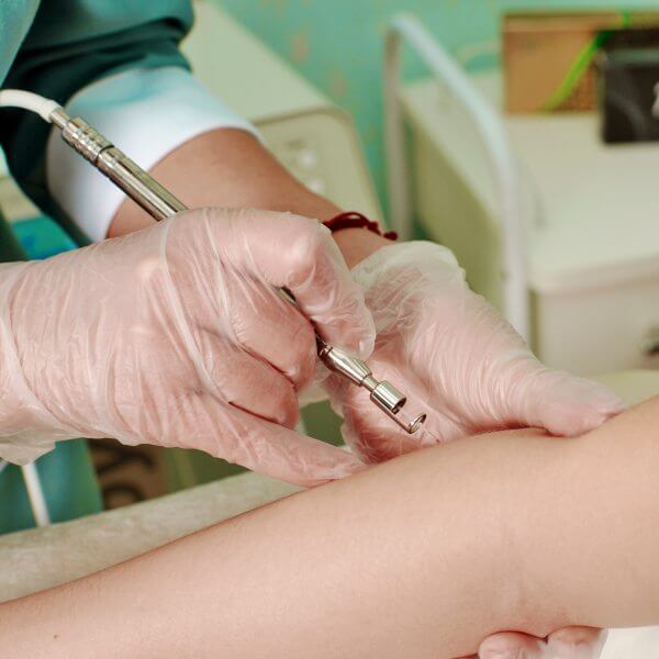 Sob sedação e anestesia local, inserimos um microcateter pela veia até chegar nas varizes pélvicas. Lá, liberamos pequenas molas (coils) ou uma espuma especial que fecha essas veias doentes.